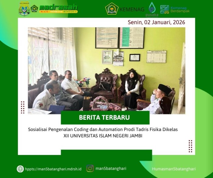Batang Hari 02 Febuari 2026 MAN 5 Batang Hari menerima kegiatan sosialisasi pengenalan coding dan automation yang diselenggarakan oleh Program Studi Tadris Fisika Universitas Islam Negeri (UIN) Sulthan Thaha Saifuddin...