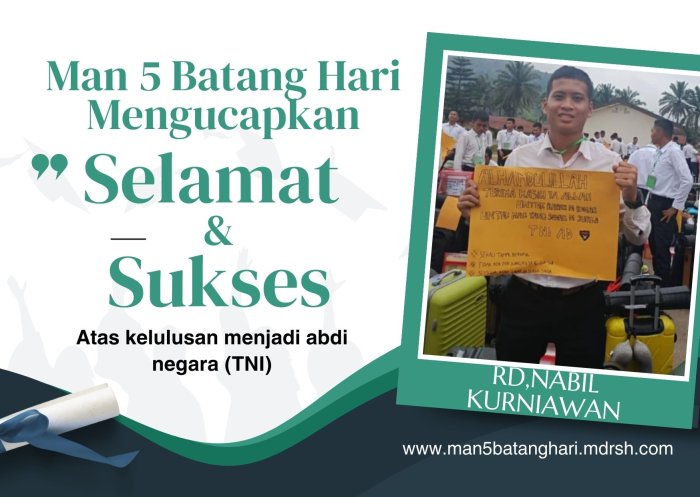 Batanghari Madrasah Aliyah Negeri (MAN) 5 Batanghari menyampaikan ucapan selamat dan sukses kepada salah satu alumninya, RD. Nabil Kurniawan, yang berhasil lulus dan resmi diterima sebagai Abdi Negara di TNI....